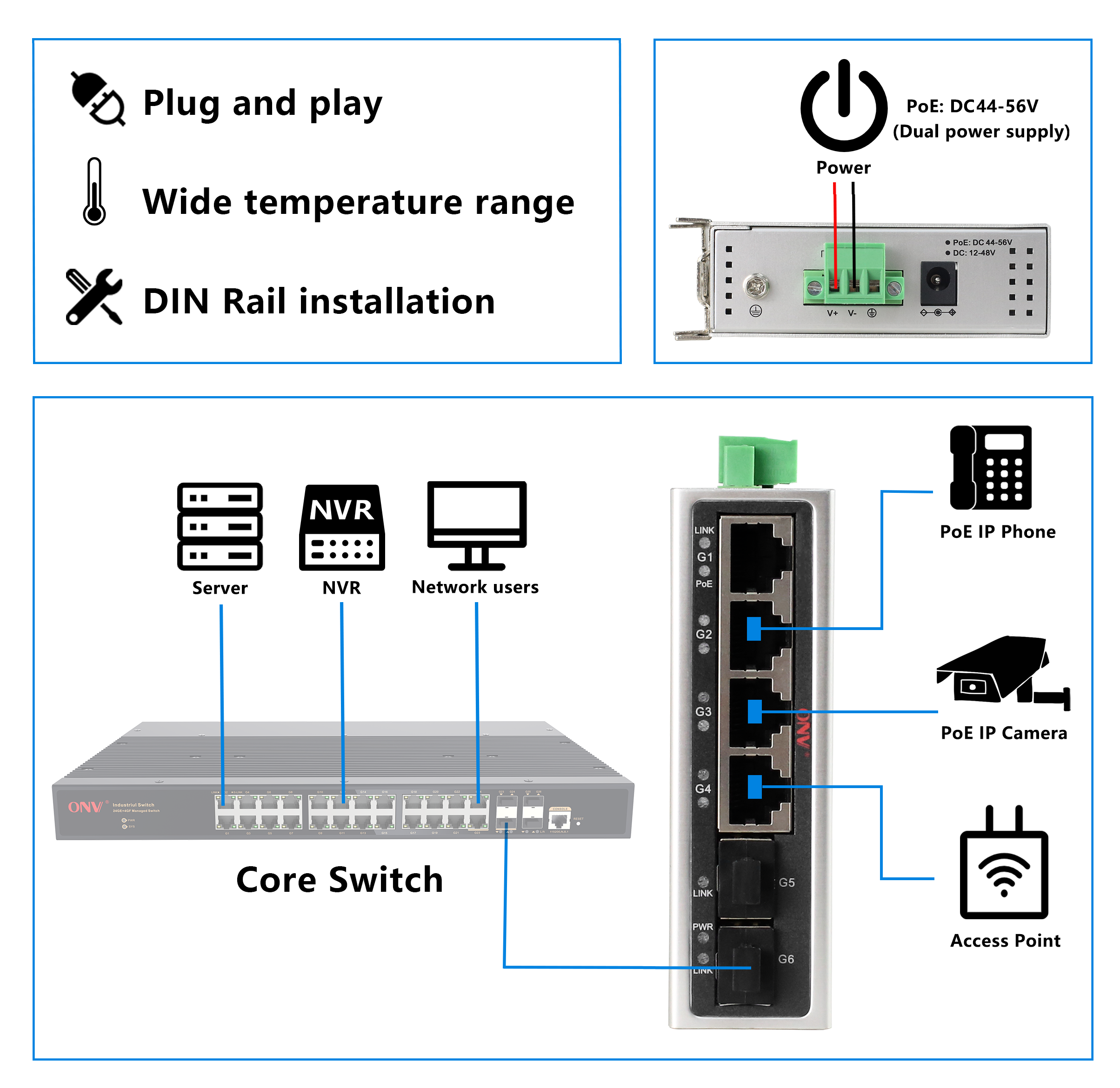 ElONV-IPS3064PFEs aGInterruptor industrial de la fibra del PoE del igabitDesarrollado de forma independiente por ONV. Tiene 4*10/100/1000Base-T adaptativoPuertos RJ45 y 2 * 1000Base-XUplinkPuertos de la fibra de SFP.Puerto 1-4Puede apoyar IEEE802,3Estándar de af/at PoEY sPotencia PoE de puerto ingle de hasta 30W.Como dispositivo de suministro de energía PoE, puede detectar y reconocer automáticamente el equipo de recepción de energía que cumple con el estándar y suministrar energía a través del cable de red. Puede suministrar energía a dispositivos terminales PoE como AP inalámbrico, cámaras IP y sensores industriales a través del cable de red. También cumple con el entorno de red que necesita una fuente de alimentación PoE de alta densidad. Es adecuado para el transporte inteligente, tránsito ferroviario, industria de la energía, minería, petróleo y transporte marítimo. Escenas industriales como la metalurgia y la energía verde, la construcción forma una red de comunicación rentable, estable y confiable. Modo no administrado, plug and play, sin configuración, fácil de usar.